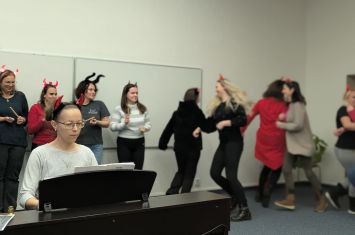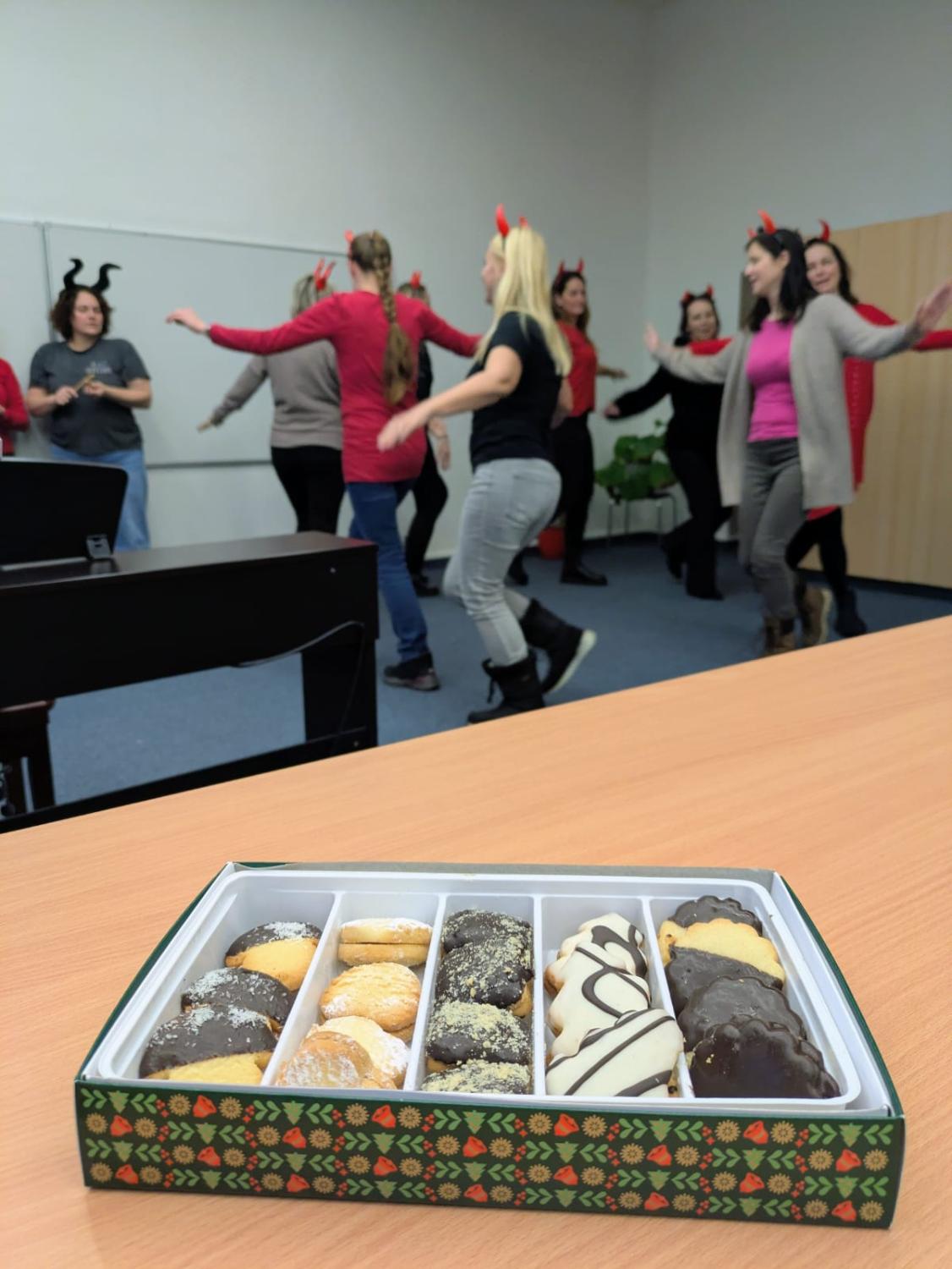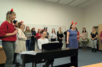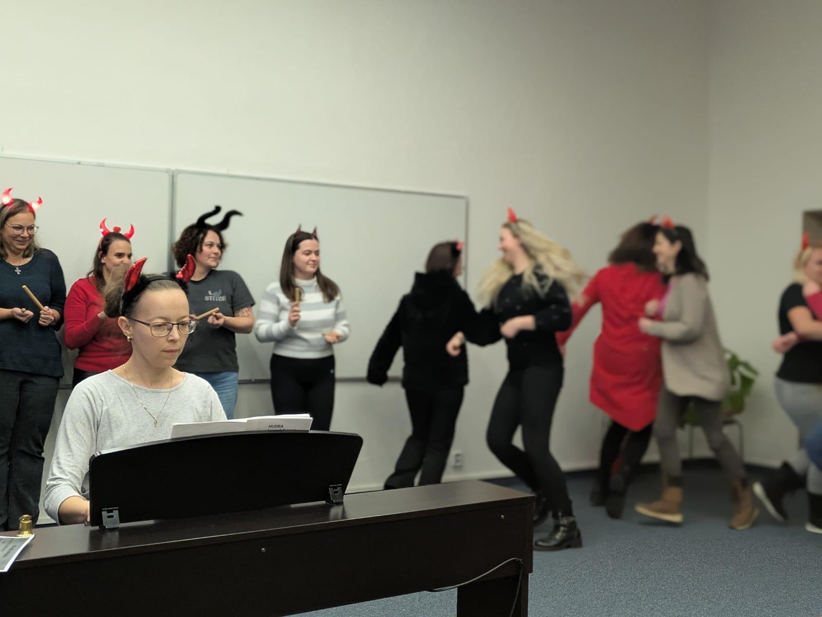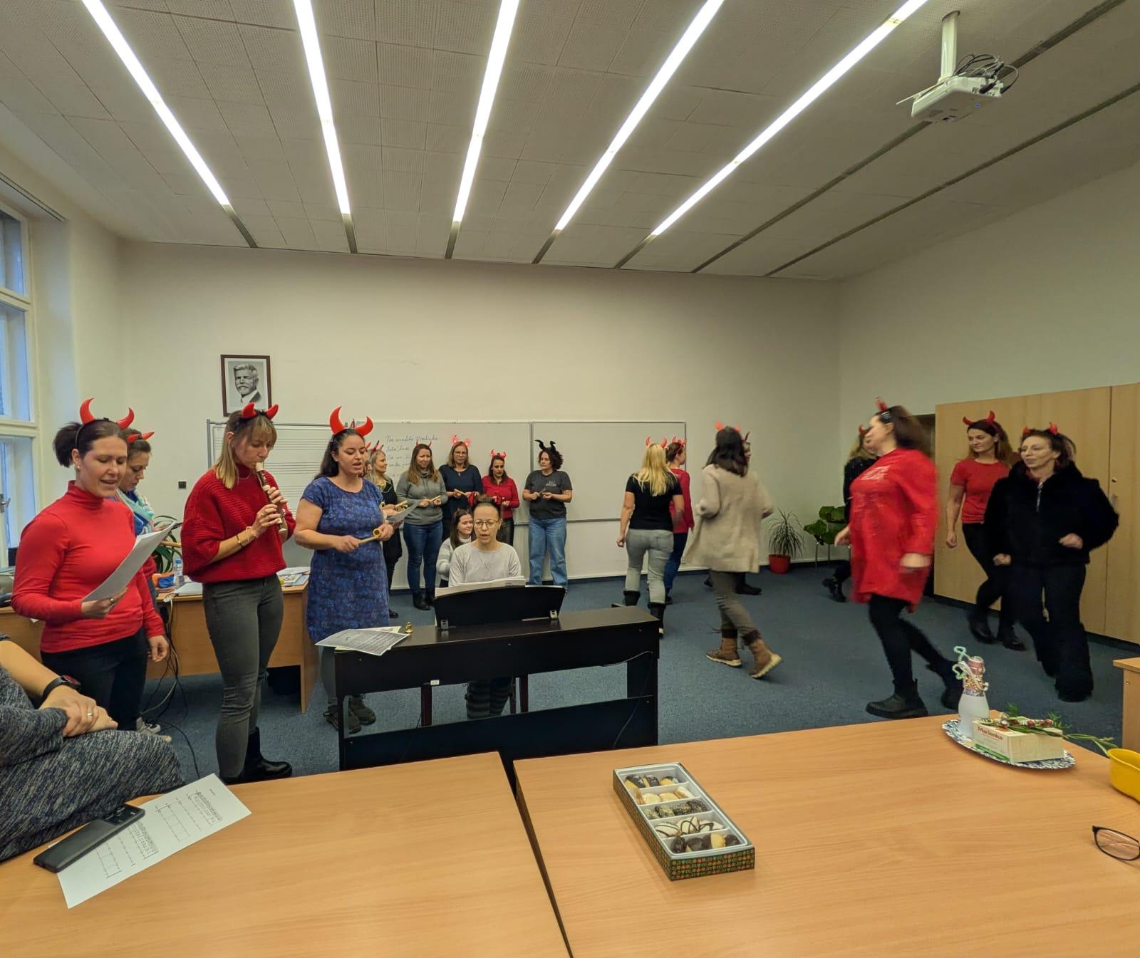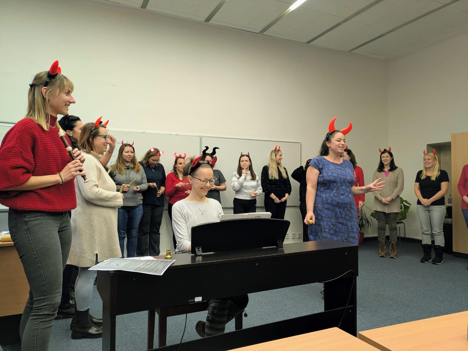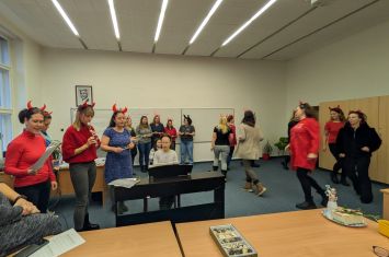 Studentky třídy 2.B předvedly v rámci své odborné přípravy pestrý program zaměřený na hudební a pohybové aktivity s čertovskou tématikou, který byl koncipován tak, aby zaujal a rozvíjel děti předškolního věku.